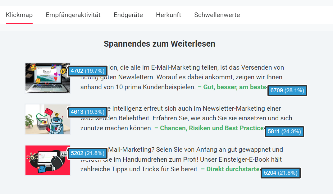 Wenn Sie über diese zehn Wege herausgefunden haben, für welche Inhalte das Herz Ihrer Abonnent:innen schlägt, ist es natürlich trotzdem weiterhin wichtig, nach jedem Versand einen Blick in die Newsletter-Statistik zu werfen. So können Sie z. B. schnell feststellen, wenn Sie sich bei einem Thema geirrt haben und der Newsletter im Vergleich eine sehr niedrige Klickrate aufweist.