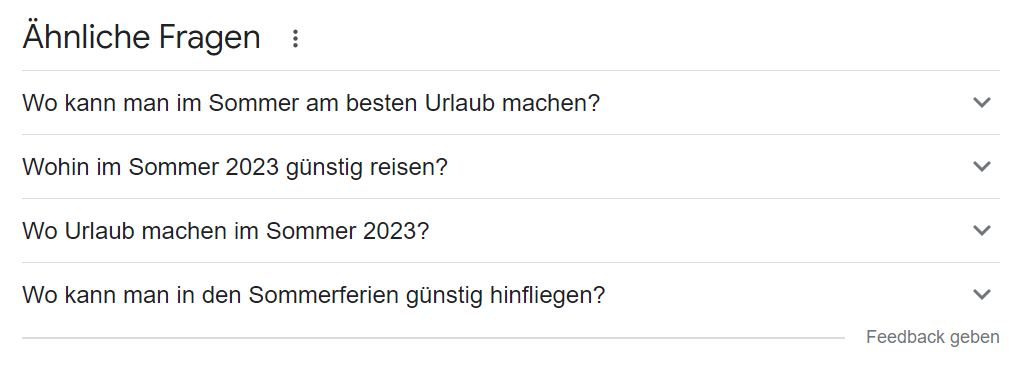 Das Feld „Ähnliche Fragen” ist eine Funktion von Google, die Fragen beantwortet, die mit der Suchanfrage des Users verwandt sind. In unserem Fall auch eine super Inspirationsquelle auf der Suche nach interessanten Newsletter-Ideen.