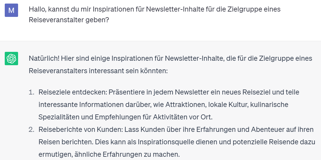 Fragen Sie doch z. B. mal bei ChatGPT nach, welche Newsletter-Inhalte für Ihre Zielgruppe interessant sein könnten. ChatGPT steht online für alle kostenlos zur Verfügung.