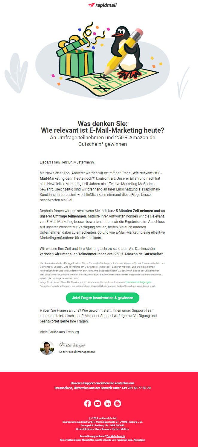 Achten Sie darauf, dass die Einleitung des Umfrage-Newsletters Ihre Leser:innen begeistert und mitreißt, anstatt die Umfrage zu trocken und emotionslos zu präsentieren. Auch mit einem Incentive können Sie noch mehr Abonnent:innen zur Teilnahme an der Umfrage motivieren: Verlosen Sie unter allen Teilnehmenden z. B. einen Gutschein für Ihren Onlineshop oder einen Frühstücksbrunch in Ihrem Café.