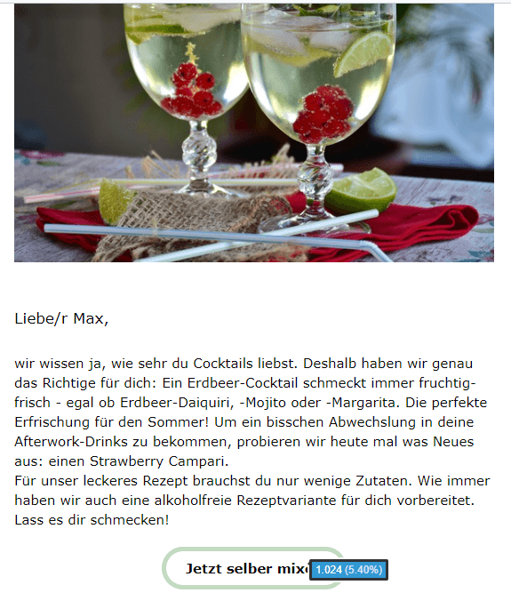 Das hat den Vorteil, dass der CTA im Mailing bei allen E-Mail-Programmen direkt angezeigt wird. Er ist also auch sichtbar, wenn eine Abonnentin oder ein Abonnent die Newsletter-Bilder nicht per Rechtsklick herunterlädt. Es besteht also trotz fehlender Bilder die Chance, dass Ihre Kontakte auf den eingebauten Call-to-Action klicken. Probieren Sie es direkt aus!