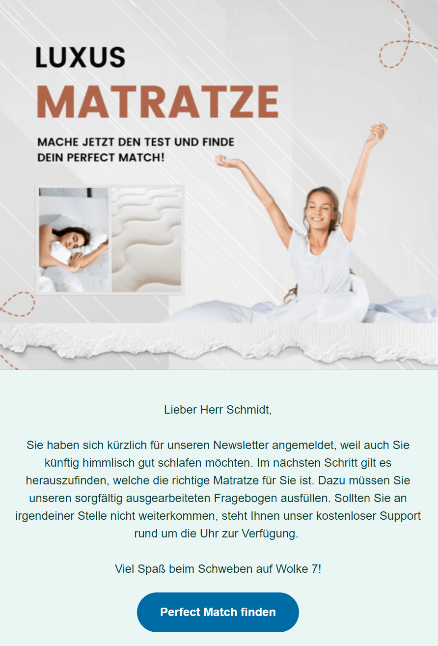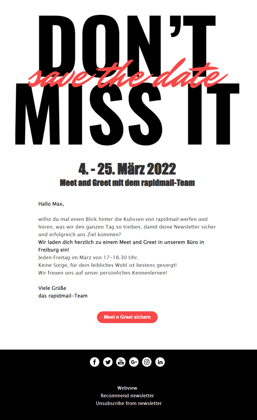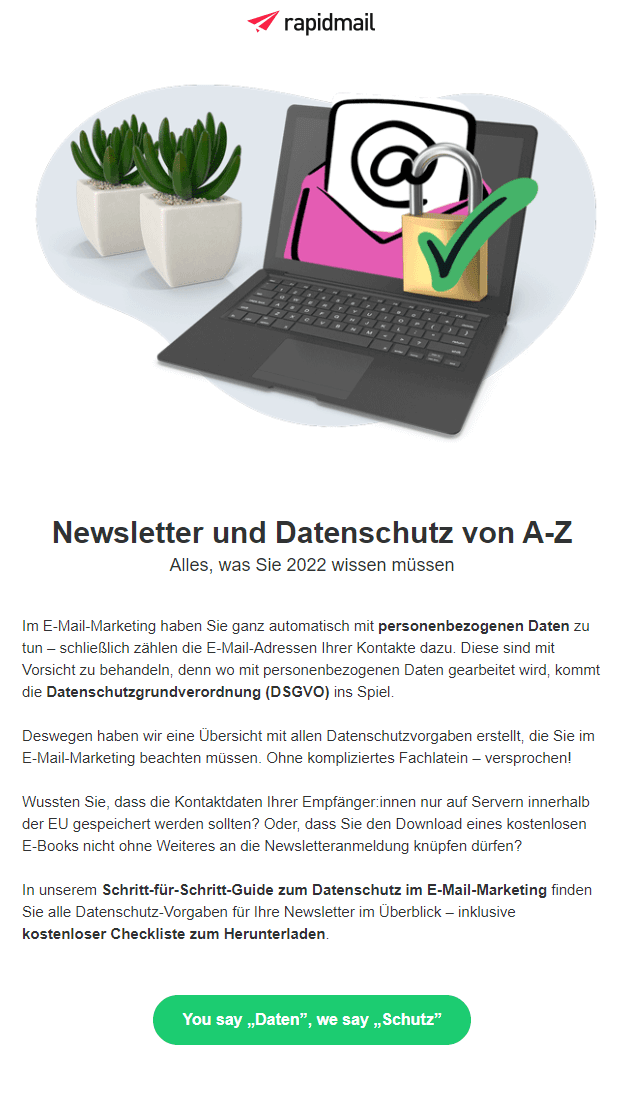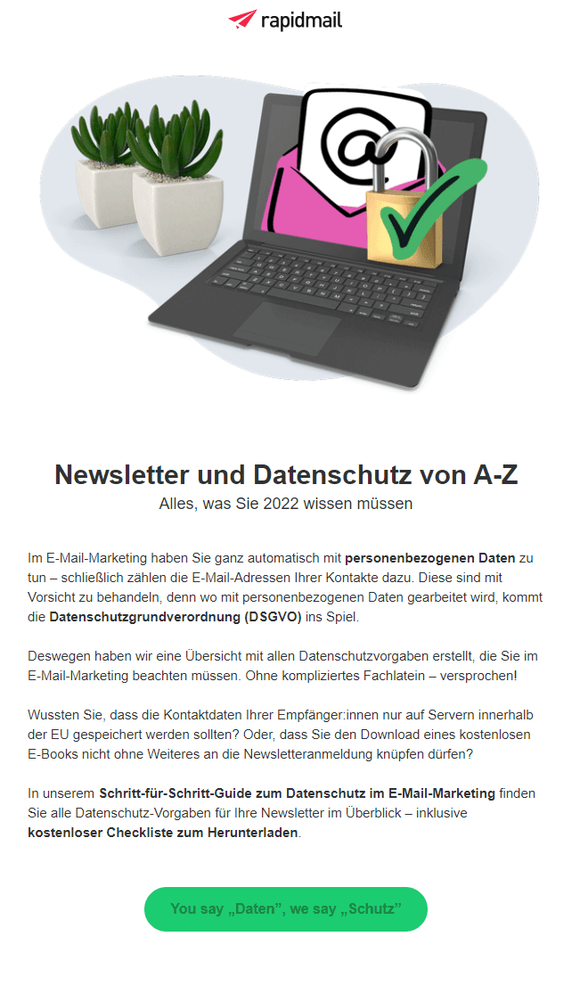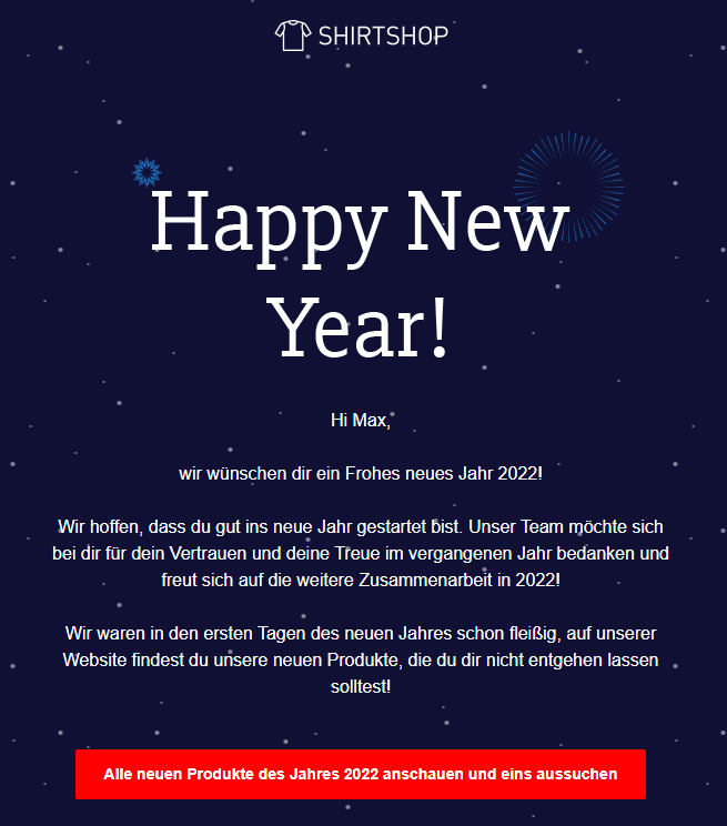 Versuchen Sie auch, den Newsletter-Text so persönlich wie möglich zu gestalten. Neben einer persönlichen Ansprache Ihrer Abonnent:innen können Sie – je nach Anlass – auch ein paar Sätze zur Geschichte Ihrer Firma oder Funfacts aus dem Büroalltag einfließen lassen.Der CTA ist dabei das Happy End Ihrer Geschichte, über das sich Ihre Empfänger:innen am Ende freuen dürfen!