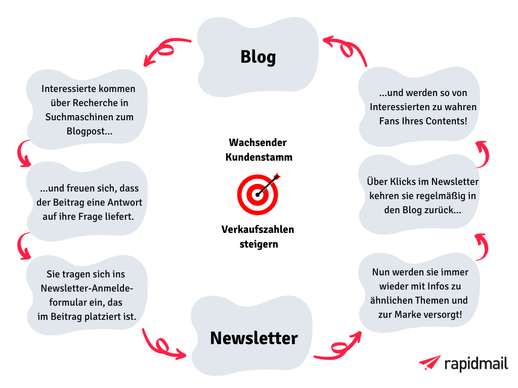 Stellen Sie es sich wie einen Kreislauf vor, der verschiedene Ebenen immer wieder miteinander verbindet: Im Blogpost bauen Sie das Newsletter-Anmeldeformular ein, damit Ihre Empfängerliste wächst, aber auch, damit die Leser:innen von zukünftigen Blogbeiträgen erfahren. Gleichzeitig verlinken Sie Blogbeiträge in Ihren Newslettern, sodass Abonnent:innen auf diesem Wege erst auf Ihren Blog aufmerksam werden.