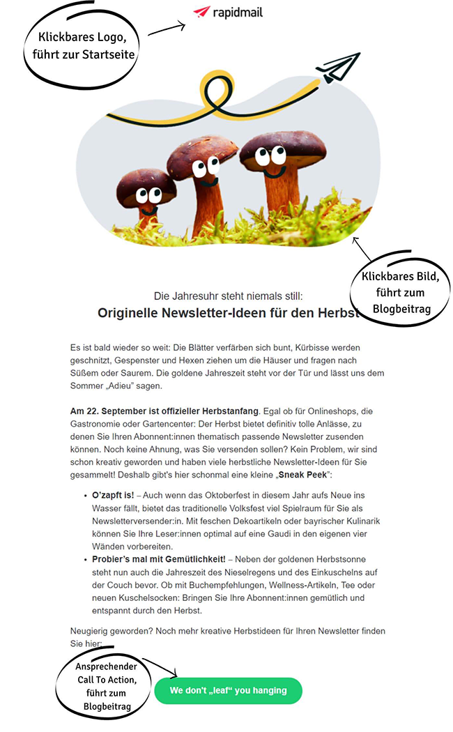 | Sprachlicher Stil | Hier haben Sie jegliche Freiheiten! Unser Tipp: Bleiben Sie locker in der Sprache und erzeugen Sie Nähe, indem Sie mit den Leser:innen auf Augenhöhe kommunizieren. | Ein Newsletter sollte ansprechend geschrieben und mit einem persönlichen Touch versehen sein: Diese Nähe kann sowohl durch einen lockeren Text als auch durch eine personalisierte Ansprache der Empfänger:innen erzeugt werden. |