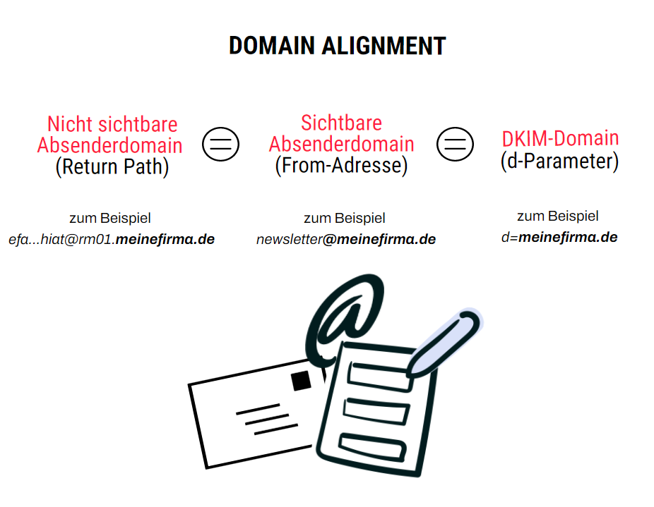 - DKIM-Alignment: Die im E-Mail-Header gespeicherte DKIM-Domain muss mit der sichtbaren Absenderdomain („From-Adresse”) übereinstimmen.
