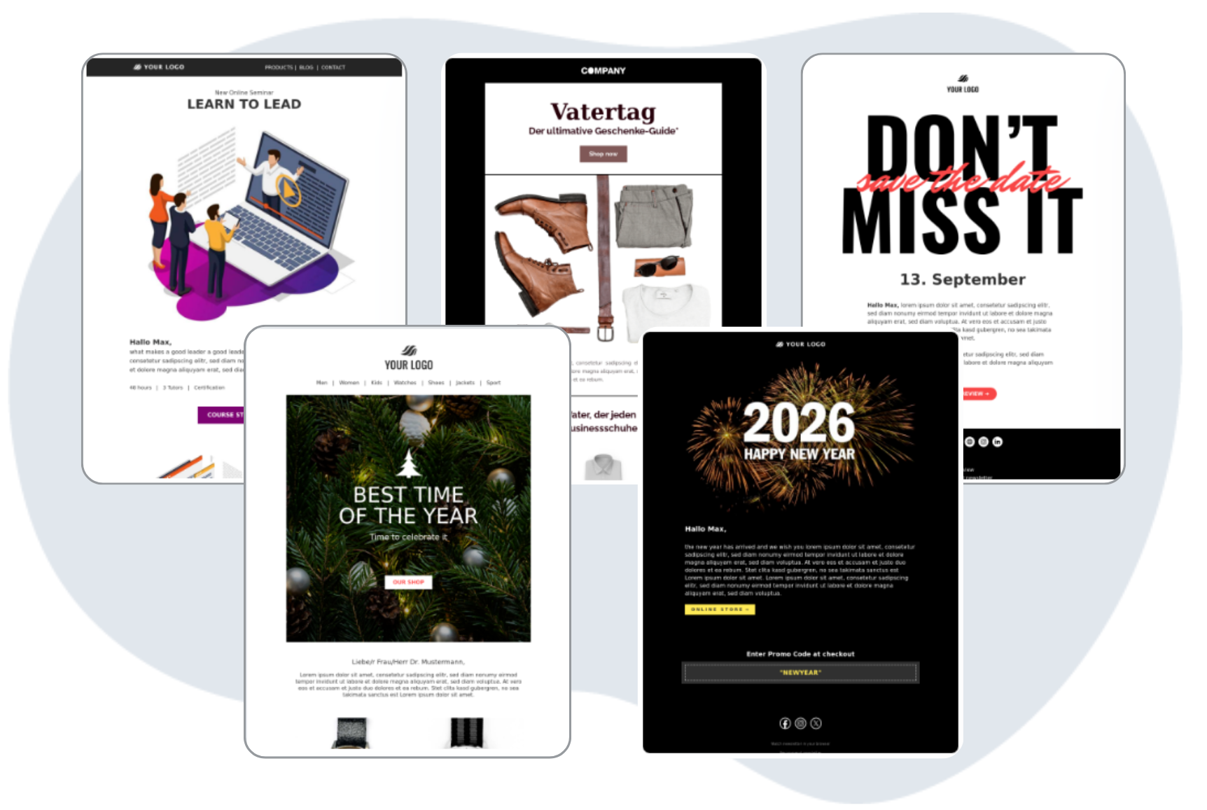 rapidmail bietet Ihnen eine große Auswahl an kostenlosen mobil optimierten Newsletter-Vorlagen für jeden Anlass. Darunter befinden sich auch viele moderne Newsletter-Vorlagen, mit denen Sie minimalistisches Design ganz ohne Aufwand umsetzen können. Viele Templates lassen sich außerdem mithilfe des 1-Klick-Designs mit wenigen Klicks an Ihr Corporate Design anpassen. Probieren Sie es doch einfach mal aus!