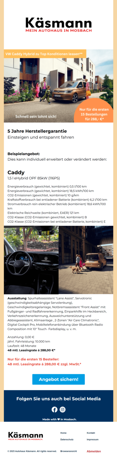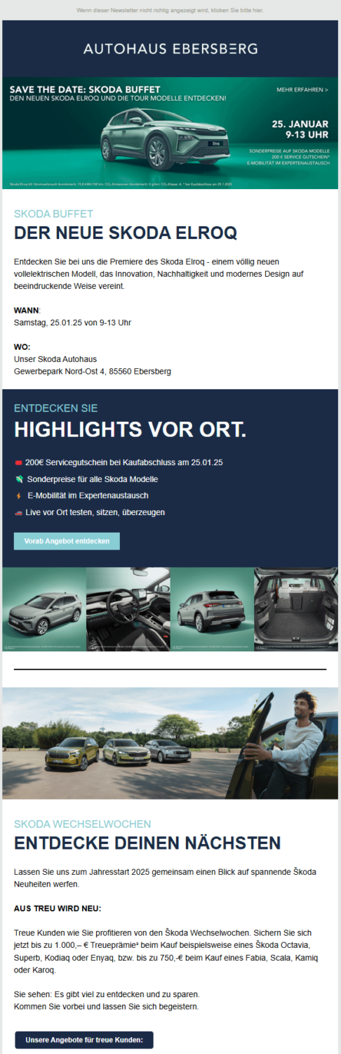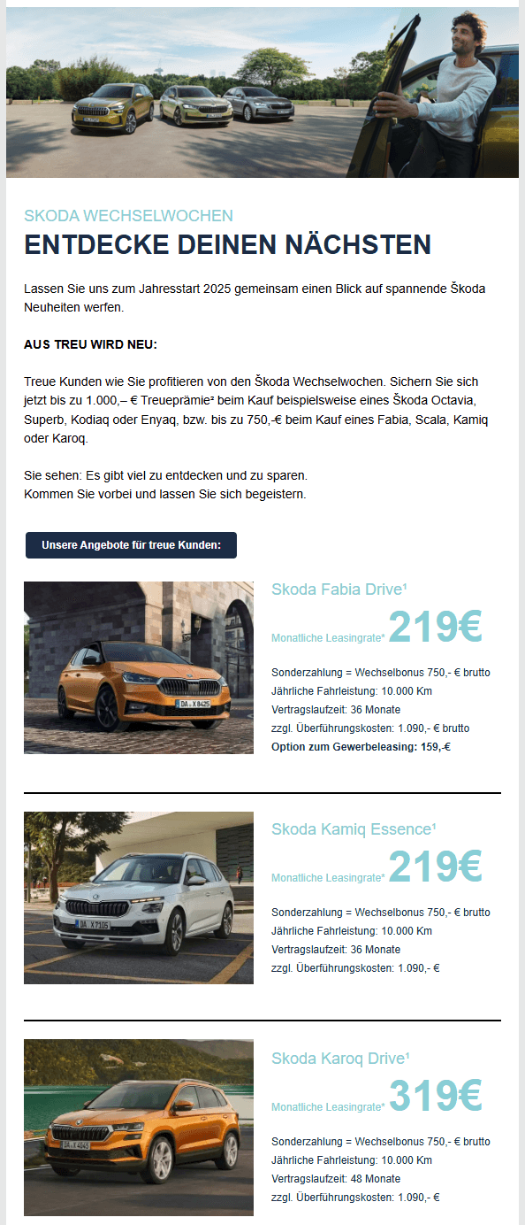 - 📆 Für Ankündigungen neuer Modelle oder Sonderaktionen: Hier sollten Sie keine feste Frequenz erzwingen, sondern nur dann einen Newsletter versenden, wenn Sie wirklich Neuigkeiten oder interessante Aktionen zu verkünden haben.