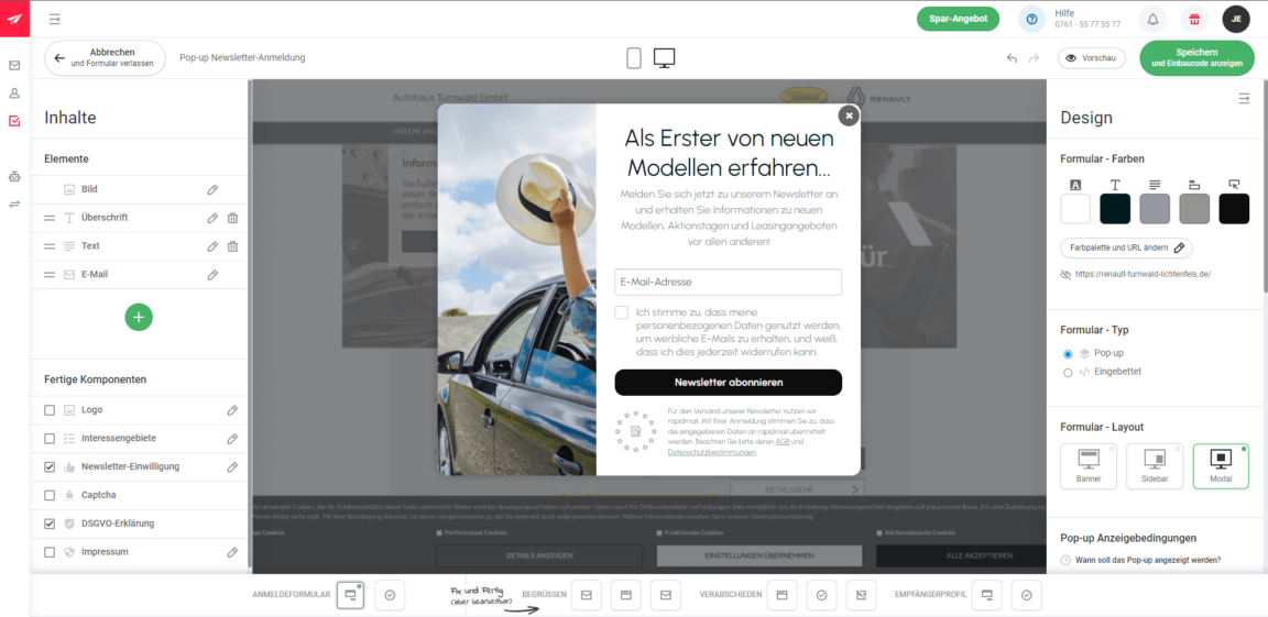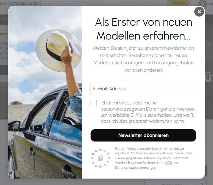 - 🌐 Website als Lead-Magnet: Ihre Website ist die perfekte Plattform, um wertvolle Leads zu sammeln. Platzieren Sie Anmeldeformulare gut sichtbar, z. B. auf der Startseite, bei Probefahrtbuchungen oder im Kontaktbereich. Kombinieren Sie diese mit ansprechenden Call-to-Action-Buttons wie „Jetzt anmelden und Vorteile sichern!“. Noch besser: Geben Sie Ihren Website-Besucher:innen einen Anreiz, etwa einen 10 € Gutschein oder exklusive Inhalte, um die Anmeldung noch attraktiver zu gestalten.
