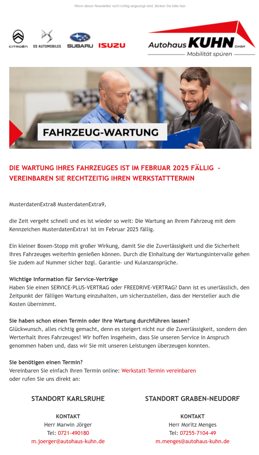 - 💌 Langfristige Bindung aufbauen dank personalisierter Inhalte: Die Konkurrenz wächst und die Ansprüche Ihrer Kund:innen steigen? Mit E-Mail-Marketing haben Sie den direkten Draht zu Ihrer Zielgruppe. Passen Sie Ihre Botschaften über automatisierte E-Mails an individuelle Bedürfnisse an: Erinnern Sie Ihre Kundinnen und Kunden zum Beispiel ganz automatisch an anstehende Termine für die Hauptuntersuchung oder daran, dass es an der Zeit ist, sich nach neuen Winterreifen umzuschauen. Damit sorgen Sie für langfristige Bindung an Ihr Autohaus bzw. Ihre Kfz-Werkstatt.