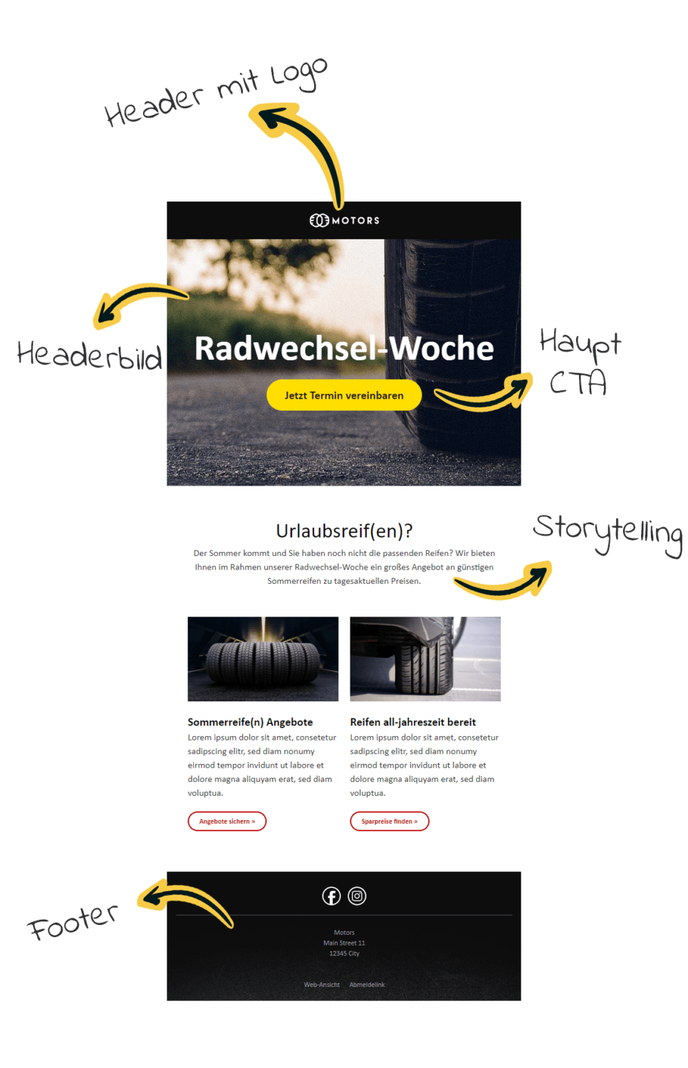 - 🎟️ Personalisierte Gutscheine für Stammkund:innen: Indem Sie Personalisierungen wie das aktuelle Automodell, den Namen Ihrer Kund:innen oder das Alter der derzeitigen Reifen in Ihren Newsletter einbinden, machen Ihre Newsletter-Texte einen ganz persönlichen Eindruck. In Kombination mit einem interessanten Angebot wie z. B. „Der nächste Reifenwechsel für Ihren [Fahrzeugmodell] zum Treuepreis von nur 29,90 €!“ werden Ihre Kontakte am besten dazu motiviert, sich direkt einen Termin zu buchen.