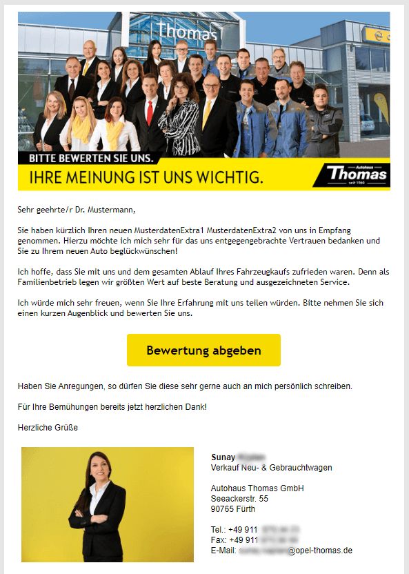 - 🌟 Neues Auto begrüßen: Eine herzliche Willkommensmail nach dem Autokauf zeigt, dass Ihnen die Beziehung zu Ihren Kund:innen auch nach dem abgeschlossenen Geschäft am Herzen liegt. Perfekt für langfristige Kundenbindung! Beispiel: „Welcome to the family! 🎊 Ihr neues Auto ist bei uns in besten Händen. Profitieren Sie von unserem exklusiven Wartungsservice.“
