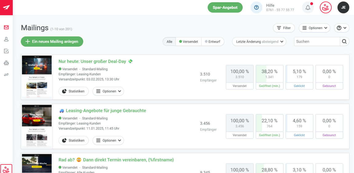 Konkret: Für jeden Euro Einsatz, den Sie in Newsletter-Marketing investieren, bekommen Sie im Schnitt 34 Euro zurück (Quelle: Litmus, 2024). Auch die Öffnungsraten im Automobilbereich liegen mit stolzen 34 % (Quelle: GetResponse, 2024) über dem Durchschnitt. Wenn Sie für Ihre Kampagnen ein professionelles Newsletter-Tool nutzen, können Sie darin selbst in Echtzeit mitverfolgen, wie gut die Marketingmethode für Ihr Unternehmen funktioniert und welche Inhalte Ihre Zielgruppe am meisten begeistern.