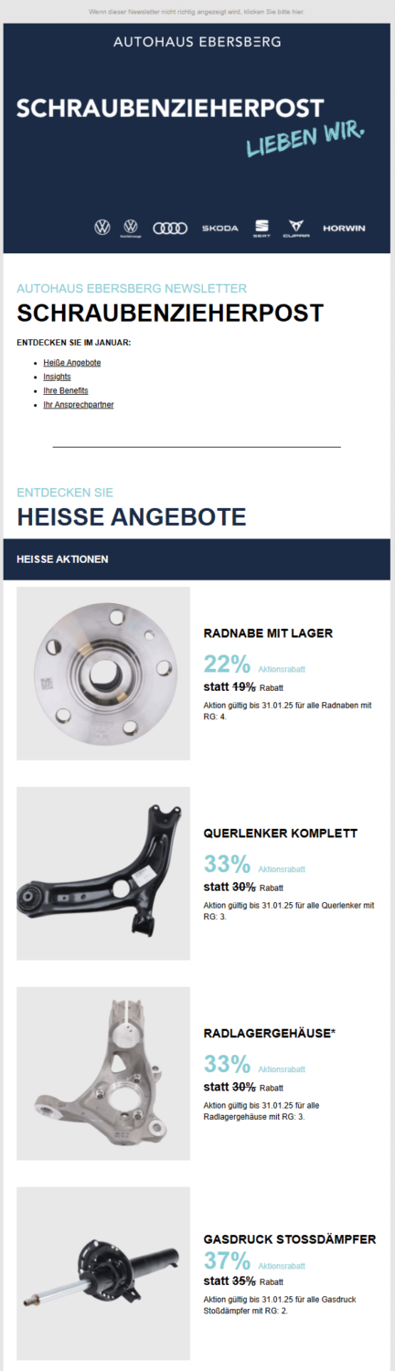 - 🎉 Aktionstage nutzen: Kampagnen wie Black-Friday-Newsletter oder Sommerdeals sind geeignete Anlässe, um besondere Rabatte zu bewerben. Mit zu den Aktionstagen passenden Botschaften und Newsletter-Betreffen wie „Black Drive-Day: Rasante Rabatte nur am Black Friday! 🚗💨“ oder „🖤 Schwarzer Lack, rote Preise: Legen Sie heute den Spargang ein!“ motivieren Sie zum Handeln.