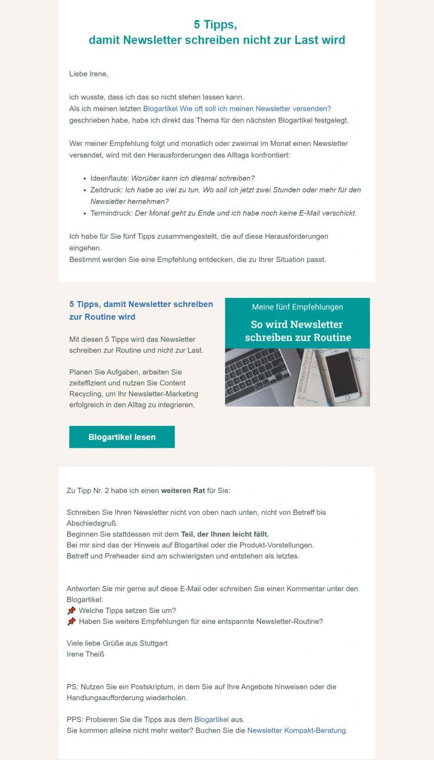 Und wenn der Mittelteil steht, arbeite ich mich dann langsam durch: Als Nächstes schreibe ich den Einleitungsteil, dann kommt der Schlussteil, also die Verabschiedung, und noch einen Call-to-Action dazu.