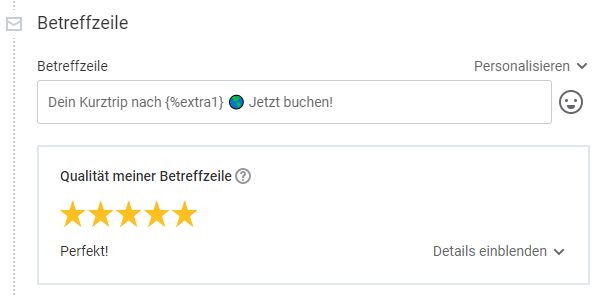Auch wenn sich die persönliche Ansprache im Betreff hervorragend dazu eignet, die Aufmerksamkeit Ihrer Empfänger:innen zu wecken, sollten Sie nur in gesundem Maße davon Gebrauch machen. Und ausschließlich bei lockeren Formulierungen, bei denen die Personalisierung nicht künstlich wirkt. Achten Sie außerdem unbedingt darauf, dass der Betreff auch bei den Empfänger:innen richtig dargestellt wird, für die Sie keine Informationen zum Wohnort vorliegen haben!