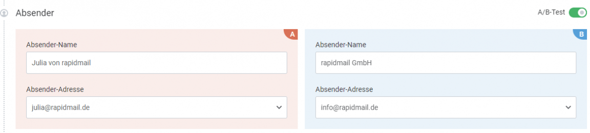 Welcher Absendername im Falle Ihrer Zielgruppe, Ihrer Branche und für Ihr gewähltes Newsletter-Thema am besten ankommt, müssen Sie für Ihren Newsletter selbst herausfinden. Am besten eignet sich dazu ein A/B-Test mithilfe Ihrer Newsletter-Software. Mit diesem können Sie anfangs verschiedene Absenderprofile auf die Reaktionen Ihrer Empfänger:innen hin testen:
