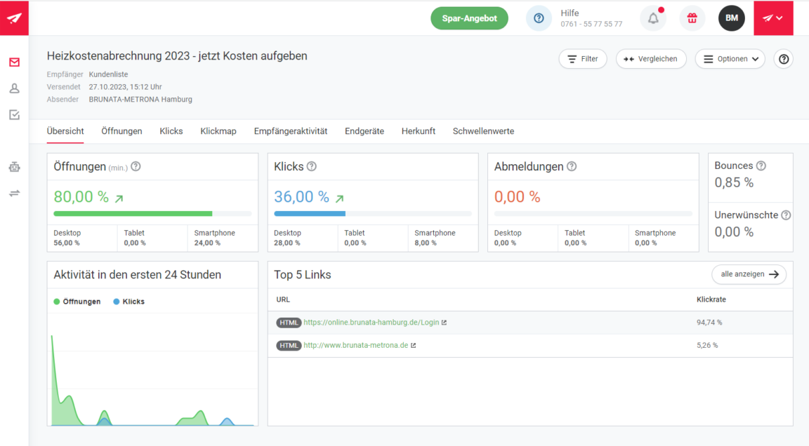 - …sehen Sie nach dem Versand automatisch in Ihrem Konto, wie erfolgreich Ihr Newsletter war: Die umfangreiche rapidmail Newsletter-Statistik zeigt Ihnen z. B., wie viele Kontakte Ihren Newsletter geöffnet und geklickt haben, wo im Newsletter sie geklickt haben oder zu welcher Uhrzeit die meisten E-Mail-Öffnungen stattgefunden haben.