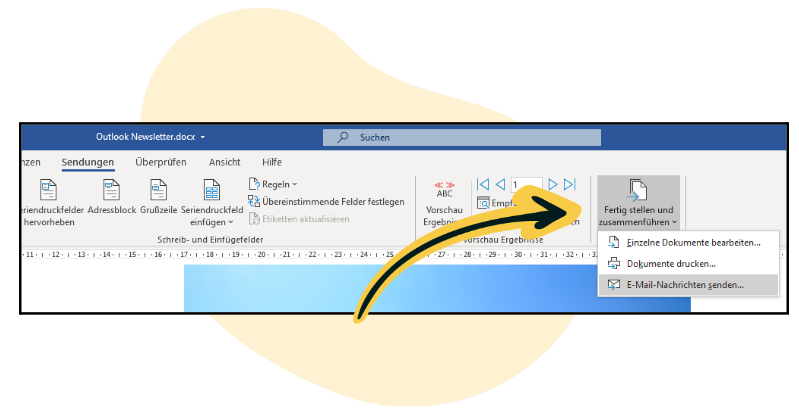 - Klicken Sie in Ihrem Word-Dokument im Menü auf „Fertig stellen und zusammenführen” und dort auf „E-Mail-Nachrichten senden”.