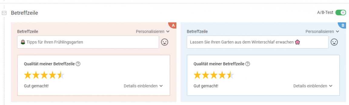 - …können Sie Ihren Newsletter-Betreff immer vorab testen: Sie sind sich nicht sicher, welche Formulierung bei Ihren Leser:innen besser ankommt? Kein Problem – mit rapidmail können Sie einfach zwei Betreff-Varianten an einem kleinen Teil der Kontakte vorab testen und anschließend den Gewinner-Betreff an die restlichen Abonnent:innen versenden.