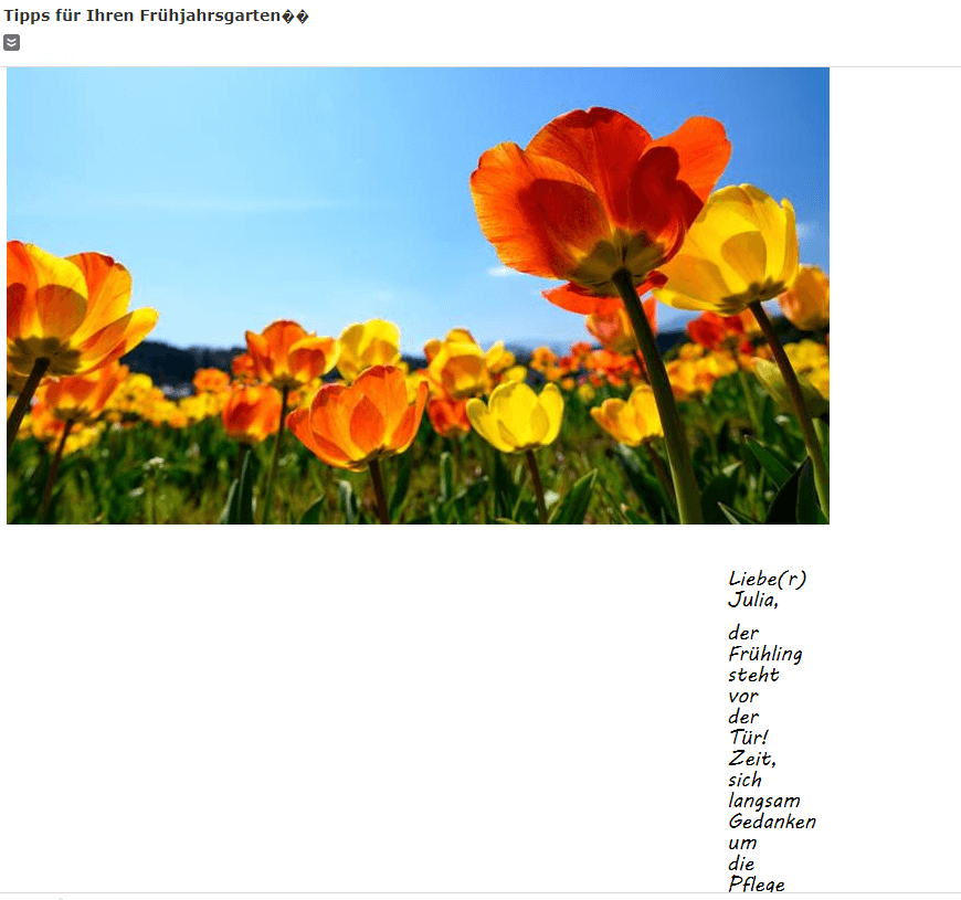 - …gibt es kaum Möglichkeiten für personalisierte Newsletter-Inhalte: Allein die Begrüßungsformel kann personalisiert werden, doch auch hier gibt es Einschränkungen.