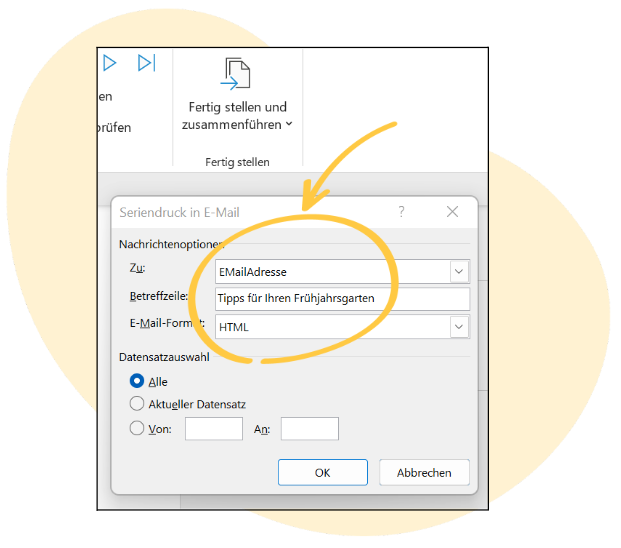 So, und jetzt ist die Serienmail auch schon versandbereit! Um die Serienmail zu versenden, klickt in der Menüleiste auf „Fertigstellen und zusammenführen” und dort auf „E-Mail-Nachrichten senden”. Dann nur noch hier auswählen, dass die Serienmail an die E-Mail-Adressen aus der Excel-Datei versendet werden soll und einen Betreff aussuchen. Beim E-Mail-Format solltet ihr „HTML-Nachricht” auswählen. Und wenn ihr dann auf „Seriendruck in Postausgang” klickt, wird eure Serienmail auch schon versendet.