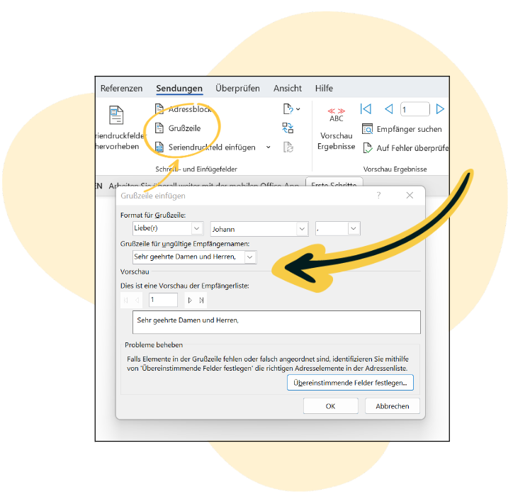 - Jetzt geht’s ans Eingemachte: Starten Sie Ihre Outlook-Serienmail am besten mit einer persönlichen Begrüßung! Wenn Ihnen neben der E-Mail-Adresse auch weitere Kontaktdaten wie Vor- oder Nachname vorliegen, können Sie diese nutzen, um Ihre Empfänger:innen im Newsletter persönlich anzusprechen. Klicken Sie dazu im Menü auf „Grußzeile”. Im Pop-up-Fenster können Sie jetzt das Format für Ihre personalisierte Anrede einstellen. Klicken Sie dann auf „OK”, steht in Ihrer E-Mail die Begrüßungsformel als «Anrede». Denken Sie unbedingt auch an die alternative Begrüßungsformel für alle Kontakte, bei denen im Newsletter-Verteiler der Name fehlt. In unserem Beispiel tragen wir hierfür „Sehr geehrte Damen und Herren” ein: