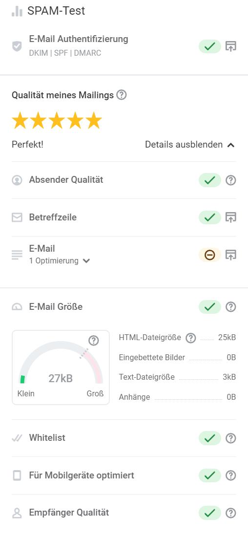 - …kommen alle Ihre Newsletter sicher ans Ziel: Das Whitelisting von rapidmail, unsere Versand-Struktur und unsere rapidmail Zustellbarkeitsexperten sorgen dafür, dass Ihre Newsletter auch wirklich bei Ihren Kontakten ankommen. Zum Beispiel wird bei rapidmail automatisch die Info in Ihren E-Mail-Header aufgenommen, dass es sich um einen E-Mail-Versand an viele Empfänger:innen handelt. Dadurch wissen E-Mail-Anbieter wie Gmail Bescheid, dass der Versand an so viele Kontakte beabsichtigt ist, wodurch das Risiko einer Spam-Einstufung sinkt. Außerdem gibt es bei uns einen automatischen Spam-Test, der Ihnen noch vor Versand Ihres Newsletters eine Einschätzung gibt, wie hoch die Wahrscheinlichkeit ist, dass das Mailing im Spam-Ordner landet.