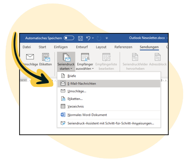 - Klicken Sie oben in der Registerkarte auf „Sendungen” und dann im Menü auf „Seriendruck starten” und „E-Mail-Nachrichten”. Jetzt befindet sich Ihr Word-Dokument quasi im Newsletter-Modus.