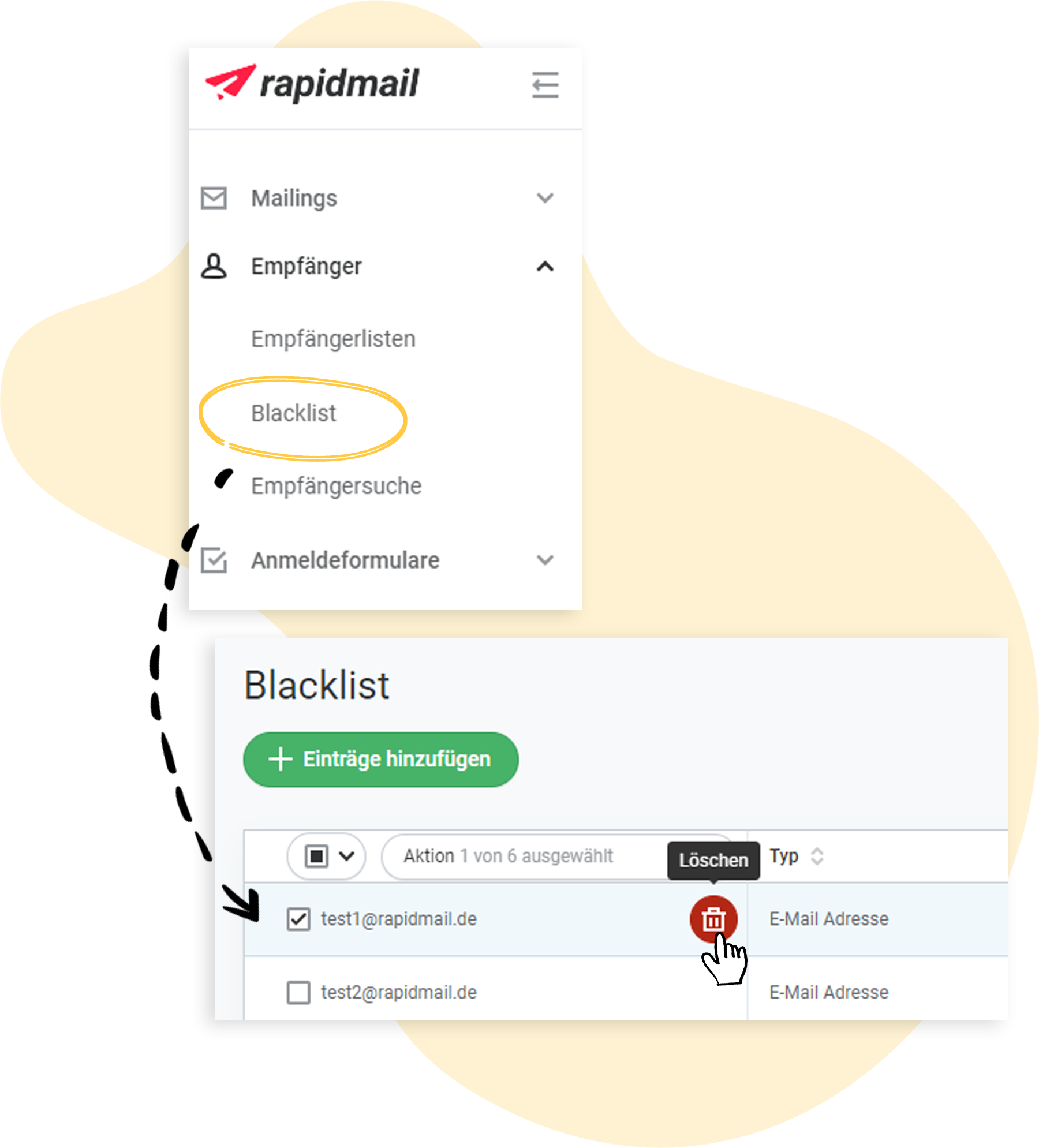 Sollen Einträge aus der Blacklist wieder entfernt werden, weil der Empfänger Sie bspw. kontaktiert und wieder Newsletter erhalten möchte, ist das möglich, indem Sie die Empfänger einzeln aus der Blacklist löschen.