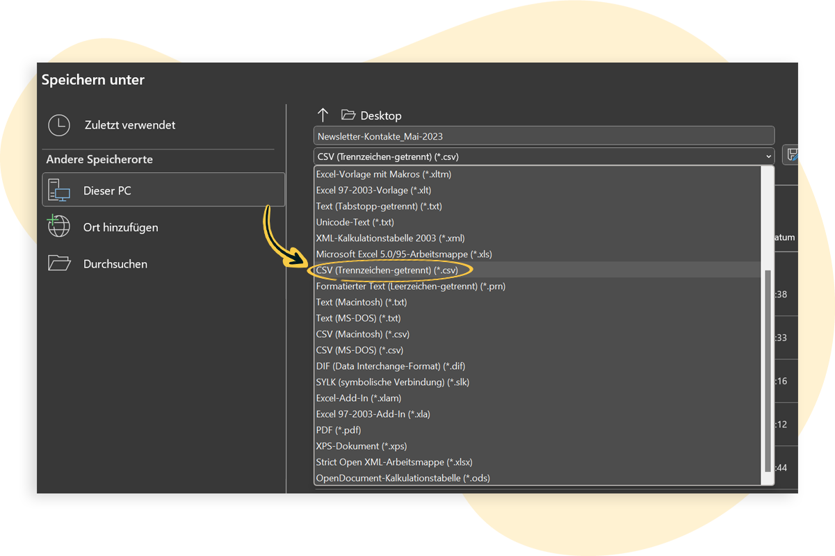- Wählen Sie nun als Format „CSV (Trennzeichen getrennt) (*.csv)” aus.