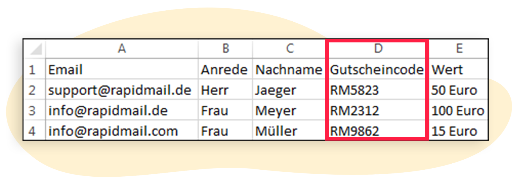 Zunächst müssen Sie Ihre Empfängerdatei entsprechend aufbauen, sodass der individuelle Gutscheincode in einer separaten Spalte aufgeführt ist. Ihre Excel-Datei kann also z. B. so aussehen: