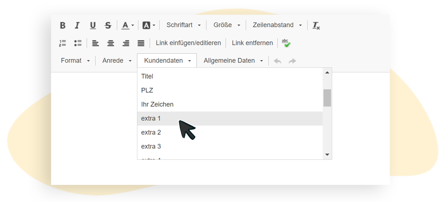 Dazu begeben Sie sich in den Editor und wählen im Textfeld > Kundendaten einfügen > extra 1 aus.