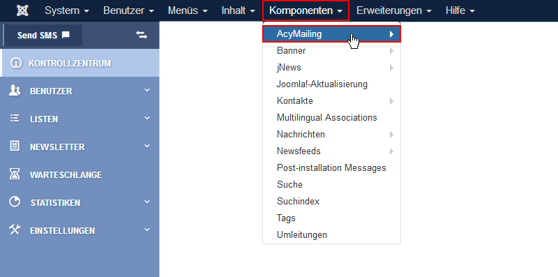 1. Klicken Sie oben im Menü auf Komponenten / AcyMailing.