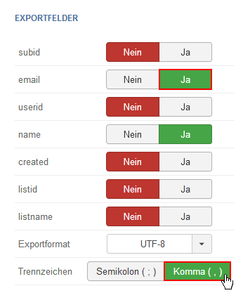 3. Wählen Sie durch Anhaken die zu exportierenden Datenfelder und klicken bei Trennzeichen auf Komma.