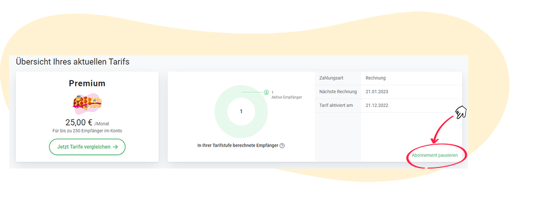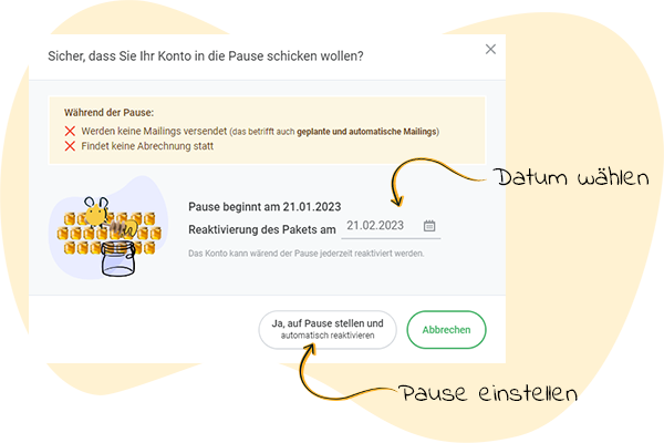 - Wenn Sie ein monatliches rapidmail Paket nutzen, können Sie jederzeit eine Pause voreinstellen.