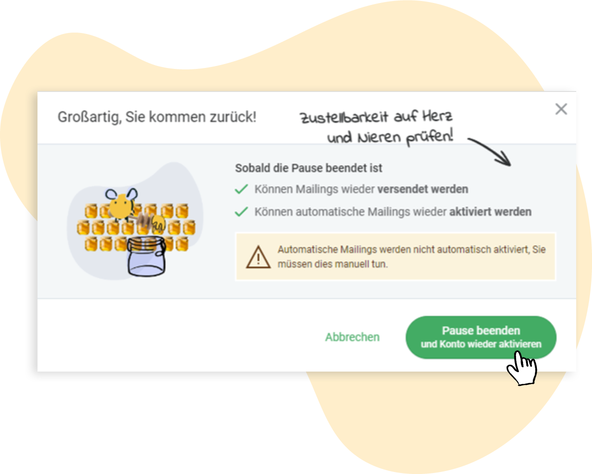 Alternativ können Sie Ihre Pause beenden, indem Sie ein Mailing versenden. Erstellen Sie Ihr dafür wie gewohnt ein Mailing und klicken Sie sich bis zur finalen Übersichtsseite durch. Dort erhalten Sie eine entsprechende Benachrichtigung.