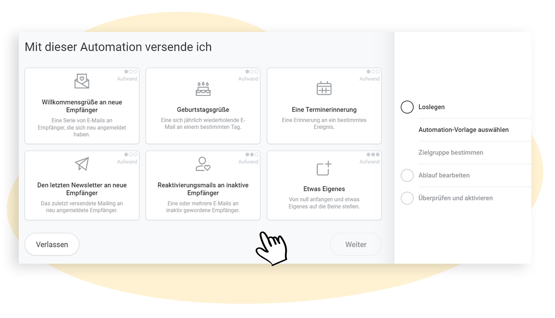 Insgesamt 7 verschiedene Vorlagen stehen Ihnen bei der Einrichtung einer Automationsserie zur Auswahl: 6 davon mit vorgefertigten Abläufen und eine Blanko-Vorlage zum Selbstgestalten. Wir haben für jeden dieser Workflows eine Schritt-für-Schritt-Anleitung vorbereitet, die Ihnen bei der Einrichtung hilft.