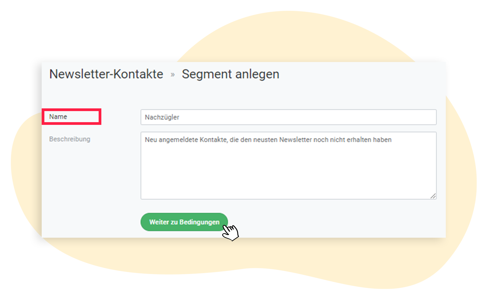 3. Vergeben Sie hier einen Namen des Segments, z. B. Nachzügler, und bei Bedarf eine kurze Beschreibung. Fahren Sie fort mit Weiter zu Bedingungen.