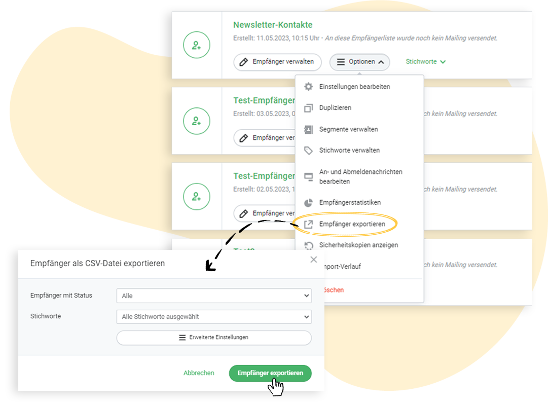 Bei jeder Ihrer angelegten Empfängerlisten finden Sie in der Listenübersicht den Button ,Optionen’. Klicken Sie den Button und anschließend auf ,Empfänger exportieren‛. Es öffnet sich ein Fenster, in dem Sie ggf. die Einstellungen für den Export festlegen können. Starten Sie den Vorgang anschließend per Klick auf den grünen Button ,Empfänger exportieren’.