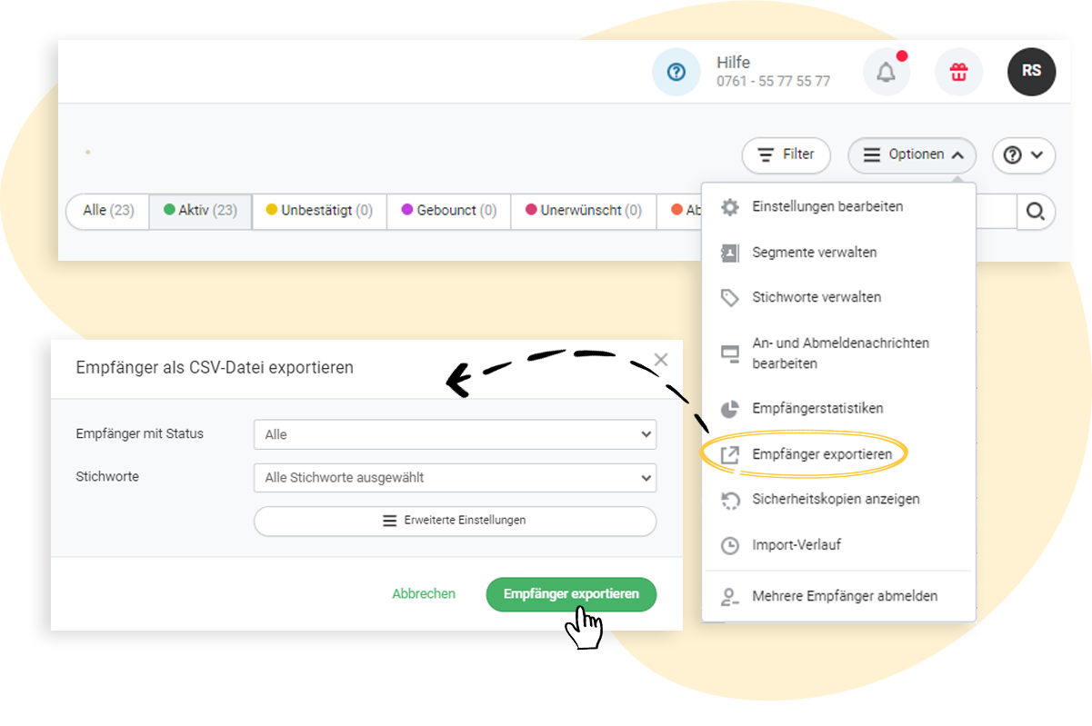 Nachdem Sie Ihre Empfängerliste aufgerufen haben, finden Sie oben rechts den Button ,Optionen‛. Klicken Sie zuerst auf den Button und anschließend auf ,Empfänger exportieren‛. Es öffnet sich ein Fenster, in dem Sie ggf. die Einstellungen für den Export festlegen können. Starten Sie den Vorgang anschließend per Klick auf den grünen Button ,Empfänger exportieren’.