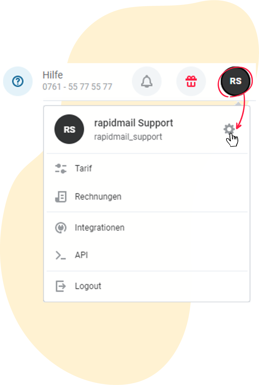 Loggen Sie sich in Ihr rapidmail Konto ein und klicken Sie oben rechts auf Ihr Kürzel und anschließend auf das Zahnrad, um zu den Kontoeinstellungen zu gelangen.