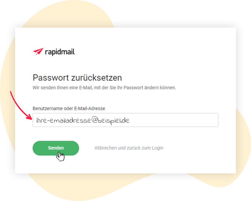 Sie werden nun aufgefordert, Ihren Benutzernamen oder Ihre E-Mail-Adresse, mit der Sie bei rapidmail registriert sind, einzugeben. Klicken Sie Senden, um den Vorgang zu bestätigen.