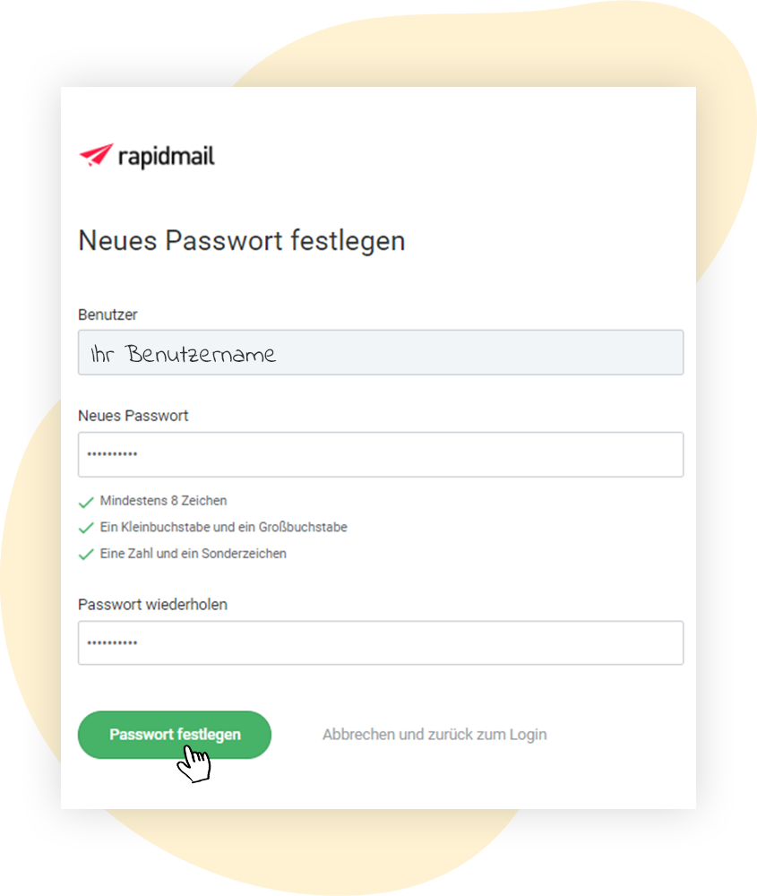 Sobald Sie den Button Passwort festlegen klicken, wird Ihr neues Passwort aktiviert und Sie können sich damit in Ihr rapidmail Konto einloggen.
