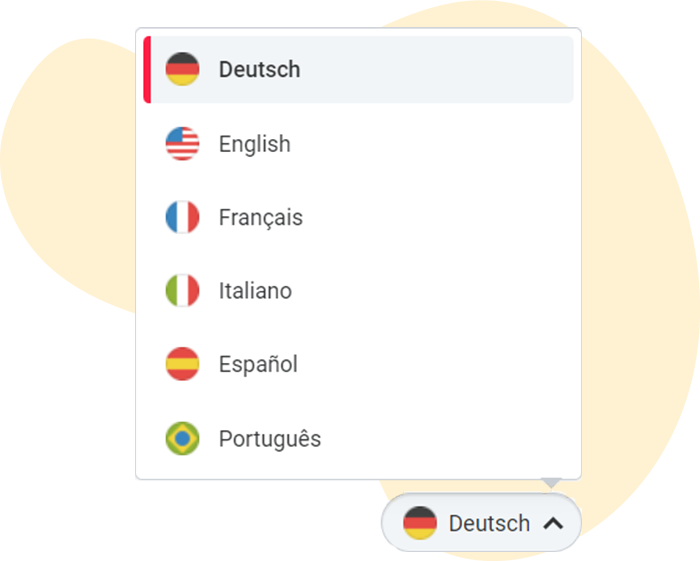 Scrollen Sie ans Ende der Seite. Unten rechts finden Sie einen Button mit Ihrer aktuell eingestellten Sprache. Indem Sie den Button klicken, werden Ihnen die alternativen Sprachoptionen angezeigt. Wählen Sie zwischen folgenden Sprachen aus: