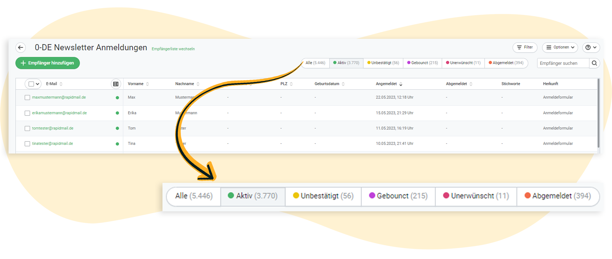 Die Kontakte in Ihren rapidmail Empfängerlisten haben jeweils einen bestimmten Status (z. B. angemeldet, abgemeldet, gebounct, …). Nach diesem können Sie Ihre Kontakte sortieren und filtern. Weiterhin können Sie die Listenansicht an Ihre Wünsche anpassen und alle beim Import hinzugefügten Spalten anzeigen oder ausblenden. In diesem Artikel zeigen wir Ihnen, wie die Empfängerverwaltung mit rapidmail funktioniert.