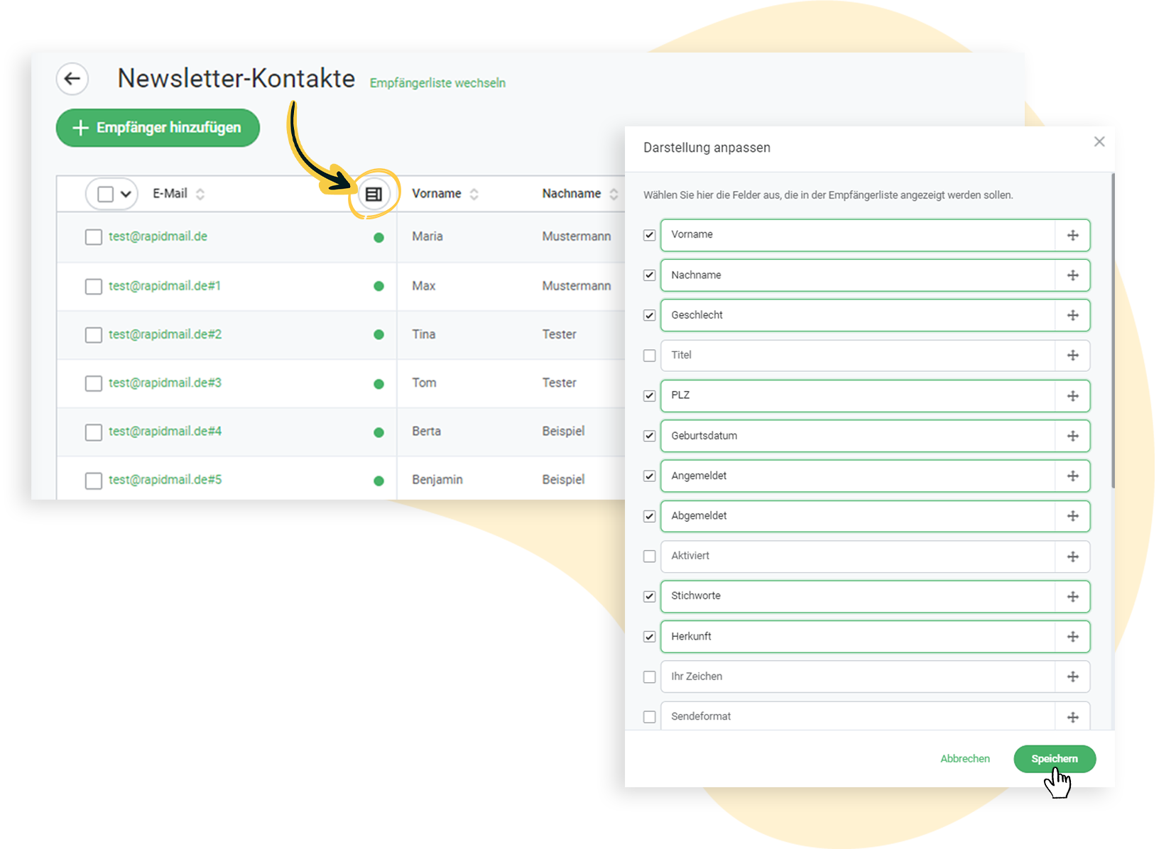 Wenn Sie sich in der Empfängerübersicht befinden, finden Sie in der obersten Spalte zwischen “E-Mail” und “Vorname” ein Listensymbol. Klicken Sie hier, um die Darstellung anzupassen.