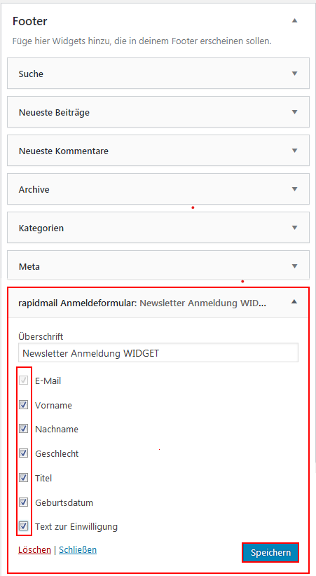 WICHTIG: Links im WordPress-Menü unter Design > Widgets klicken Sie bitte im rechten Kasten „Footer“ auf: rapidmail-Anmeldeformular.