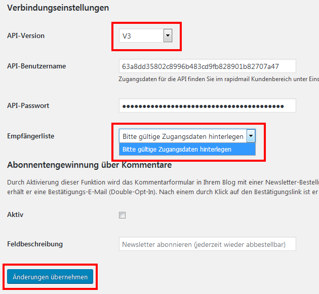 Wählen Sie danach Plugins > Installierte Plugins, um auf die Einstellungen zurückzugreifen. Wählen Sie die Settings des Plugins „rapidmail newsletter marketing“, um die Einstellungen vorzunehmen. Wählen Sie bei der API-Version V3 aus und geben Sie den rapidmail API-Benutzernamen sowie das API-Passwort ein. Sie können zunächst noch keine Empfängerliste auswählen, wählen Sie dennoch Änderungen übernehmen.
