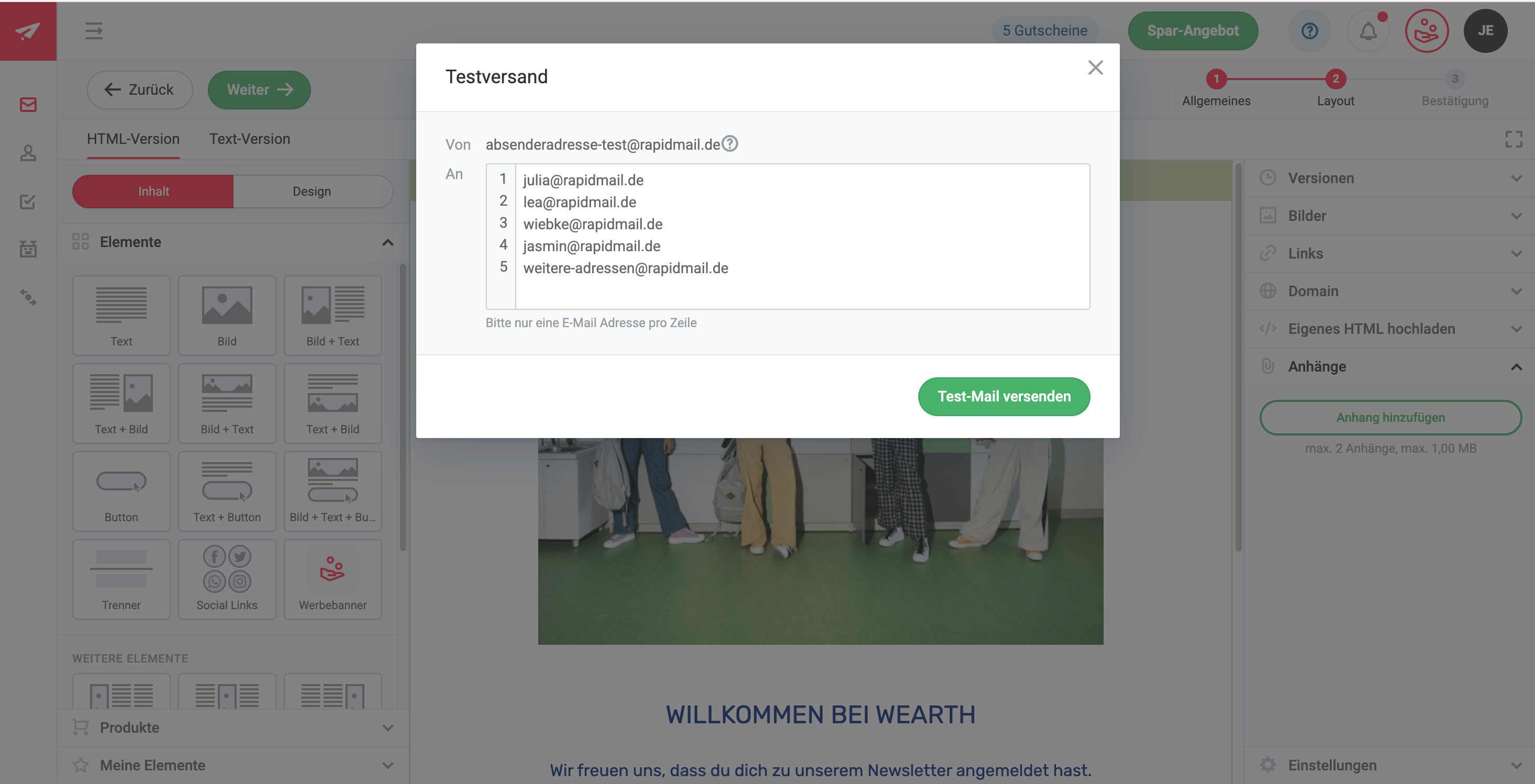 Mit der Testmail-Funktion im rapidmail Editor können Sie Ihren Newsletter vorab kostenlos an bis zu 10 ausgewählte E-Mail-Adressen verschicken – zum Beispiel an Teammitglieder, die Ihren Newsletter nochmal auf Herz und Nieren prüfen können. Schicken Sie den Newsletter als Testmail ruhig auch an sich selbst: Oft fallen einem beim finalen Check im eigenen Postfach noch kleine Details auf, die man zuvor übersehen hat.