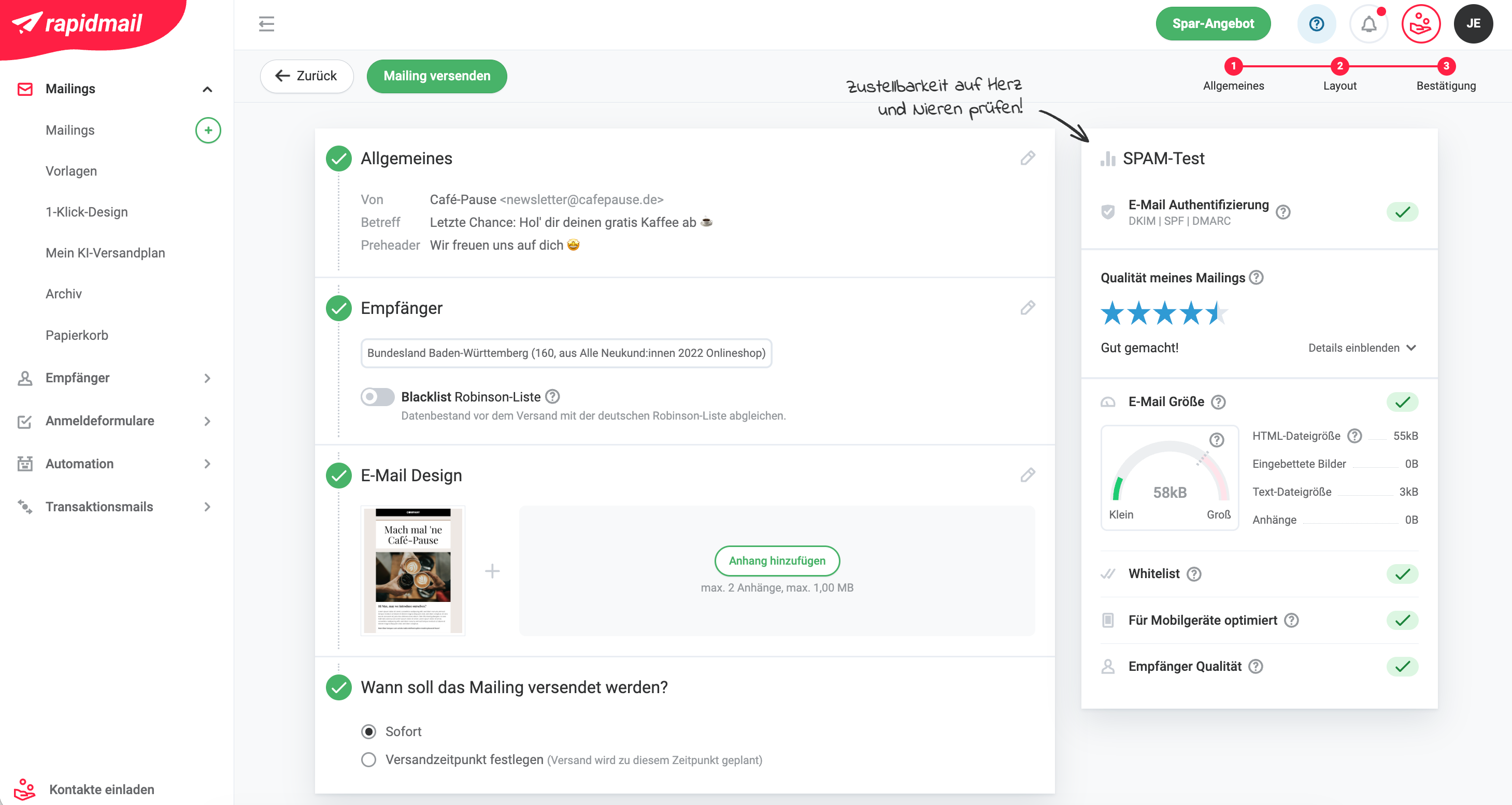 - ✅ Besteht der Newsletter den integrierten Spam-Test vor Versand, sodass er möglichst sicher im Posteingang landet?